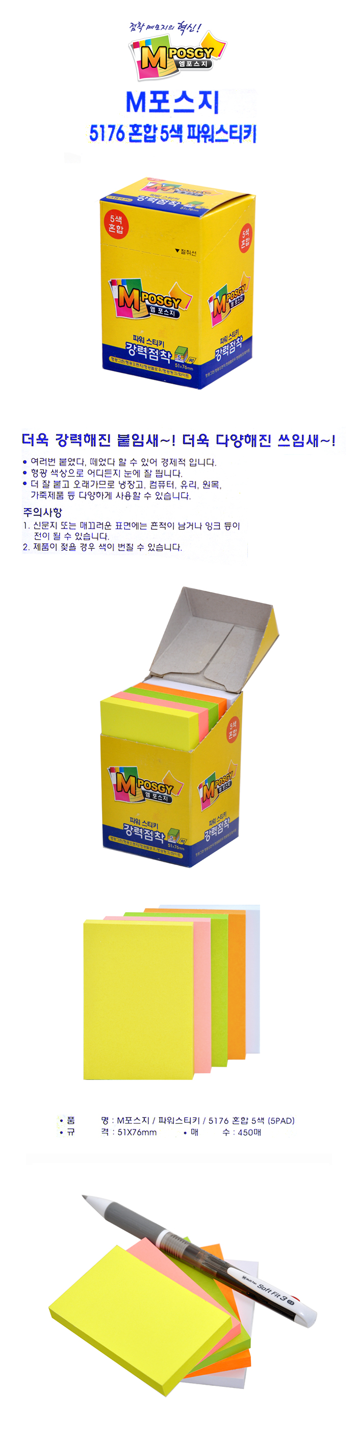 M포스지/파워스티키/5176/오피스팩 혼합5색(5PAD)