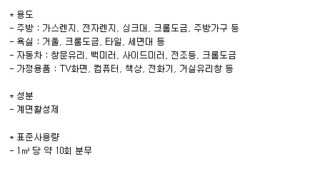 창문유리, 거울, 쇼윈도우 및 TV, 냉장고, 전화기 등 각종 전자제품 및 타일, 싱크대에 사용 가능합니다.