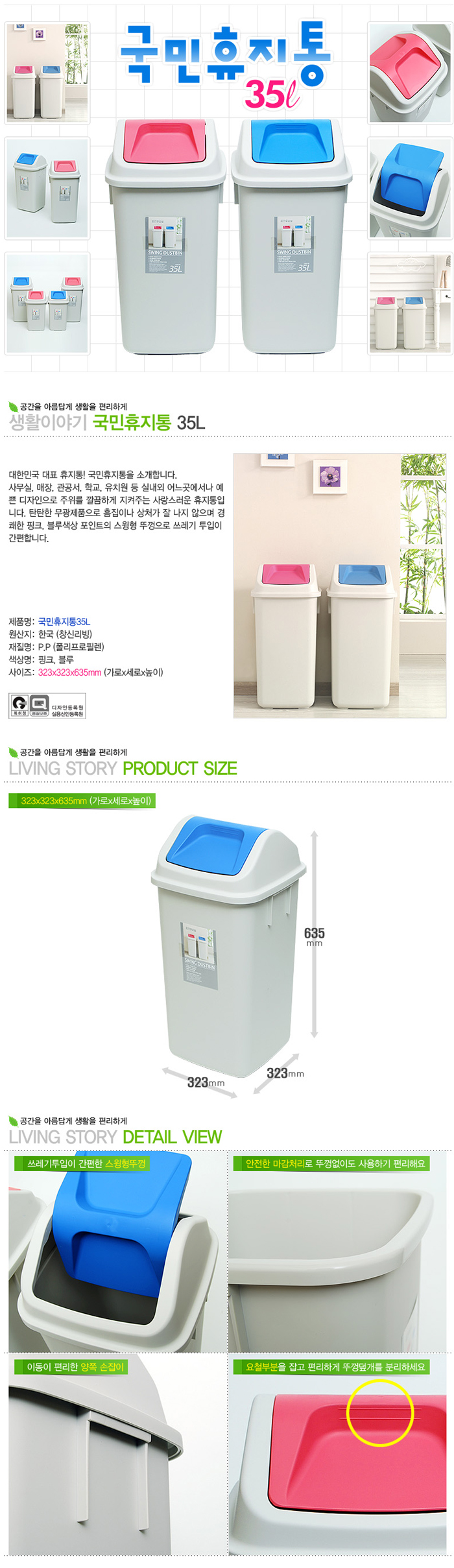 휴지통/스윙형/사각/국민 323*323*635mm/35L/그레이(구:핑크)